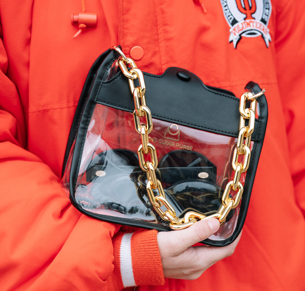 The TCP Signature Chain Purse was designed by Founder Holly Hudson, this is her go-to item at The Clear Purse.